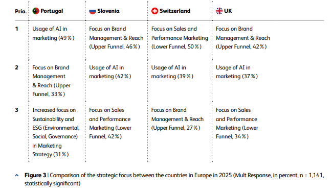O caso português, tal como evidenciado na European Marketing Agenda 2025, apresenta especificidades que merecem análise própria. A liderança da Inteligência Artificial tanto na agenda estratégica como na operacionalidade do marketing em Portugal (49% e 29%, respetivamente) demonstra um alinhamento precoce com as tendências europeias, mas também evidencia um mercado ainda em fase de consolidação tecnológica e organizacional.