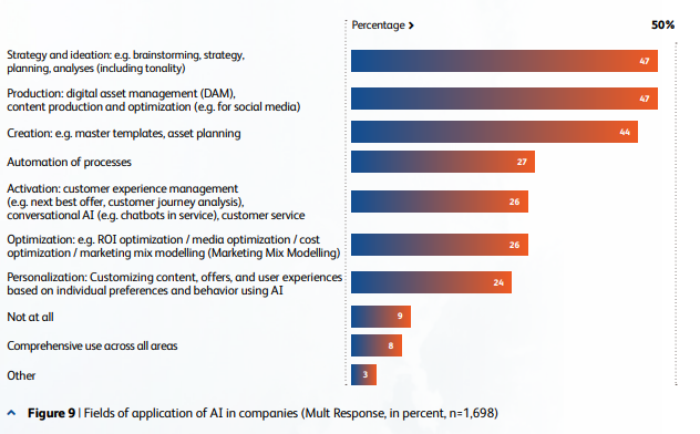 A utilização da IA distribui-se de forma equilibrada entre estratégia e ideação (47%), produção de conteúdos e assets (47%) e criação/planeamento de templates (44%). Aplicações em ativação e otimização situam-se nos 26%, enquanto a personalização atinge 24%.