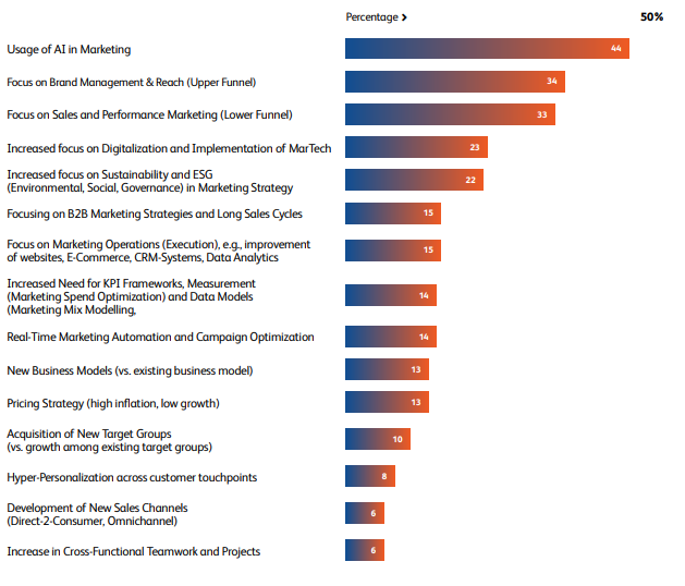 A nível europeu, 44% dos decisores colocam a IA no topo da agenda, superando a gestão de marca (34%) e o performance marketing (33%). Em Portugal, a proporção sobe para 49%, seguida da gestão de marca (33%) e da sustentabilidade/ESG (31%).